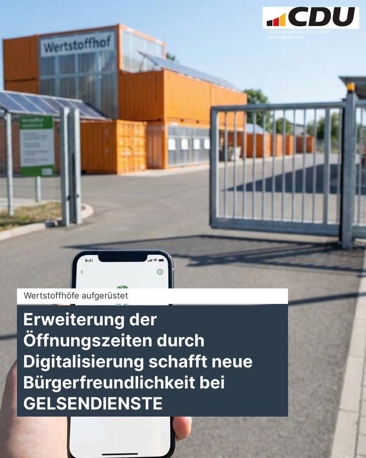 Ab 1. Dezember: Der Wertstoffhof Süd in Ückendorf startet einen erweiterten Selfservice per App & Bluetooth ? Grünabfälle 🍃 und Altpapier 📄 können außerhalb der regulären Öffnungszeiten in gebuchten 15?Min.-Zeitslots entsorgt werden. Automatischer Torzugang sorgt für geordnete Abläufe ⏱️. Die CDU (Alfred Brosch) begrüßt den digitalen Schritt für mehr Service, Sauberkeit und Effizienz, fordert aber faire Lösungen für Menschen ohne Smartphone und klare Regeln gegen Missbrauch ⚖️. Mehr dazu auf unserer Website ➡️Link zur vollständigen Pressemitteilung: https://cdu-fraktion-ge.de/news/lokal/992/Smartphone-statt-Schliessdienst-Wertstoffhof-Sued-in-Ueckendorf-mit-erweitertem-Selfservice.html