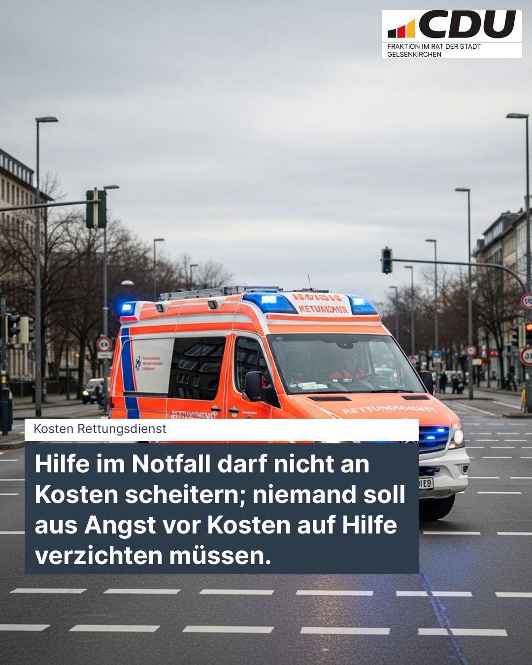Die CDU-Fraktion im Rat der Stadt Gelsenkirchen reagiert auf die aktuelle Debatte um mögliche Gebühren für Rettungsfahrten. Wie die WAZ berichtet, werden in Essen Modelle mit Sätzen bis zu 267 Euro diskutiert.