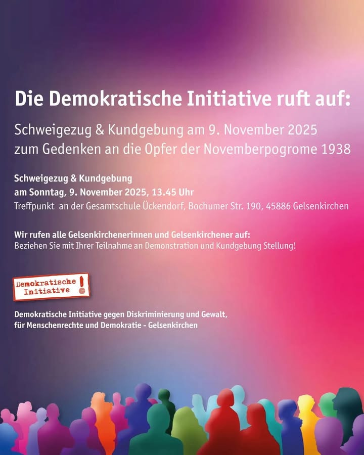 Wir unterstützen den Aufruf der Demokratischen Initiative zum Schweigezug und zur Kundgebung anlässlich des Gedenkens an die Opfer der Novemberprogrome 1938.